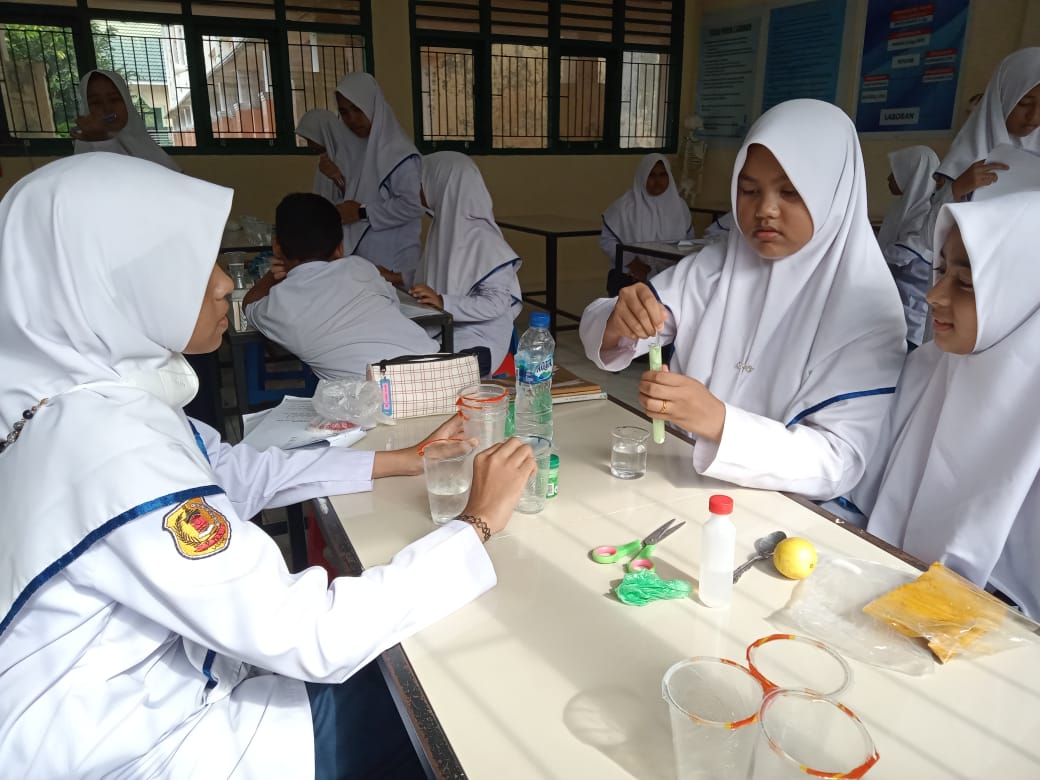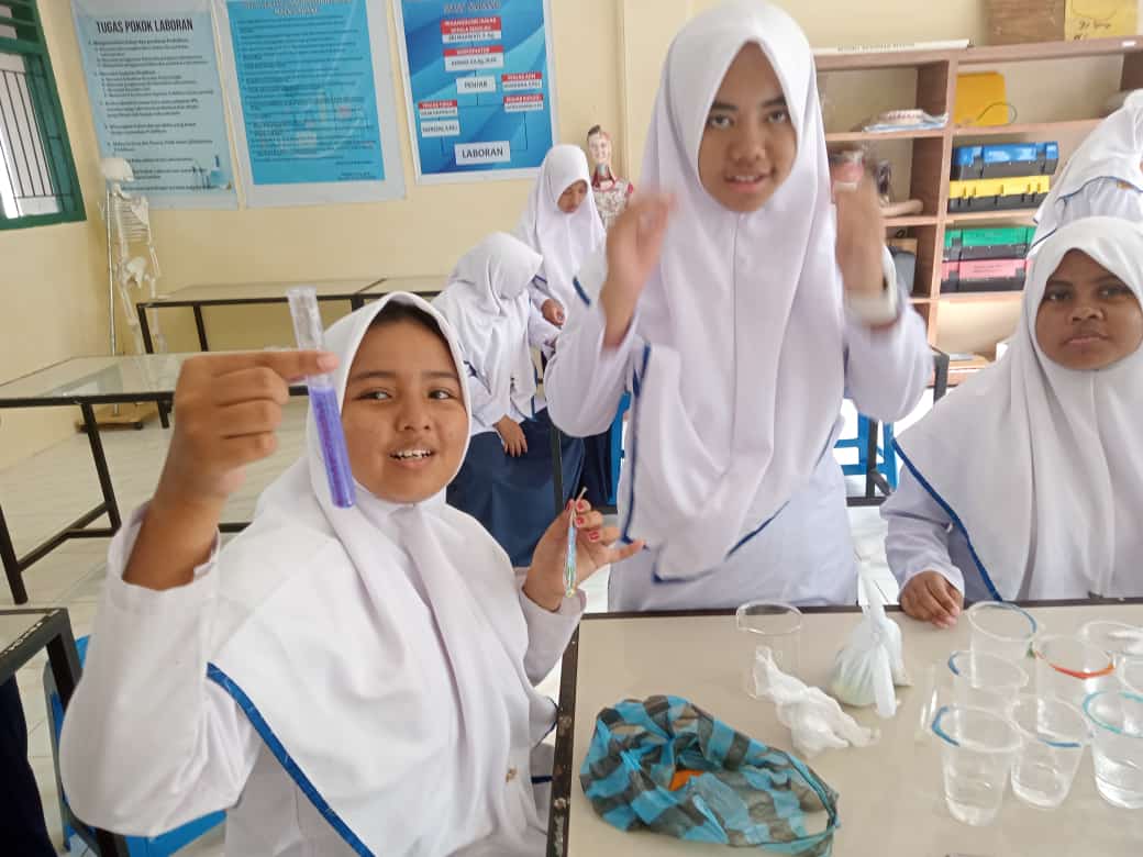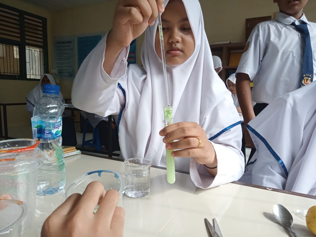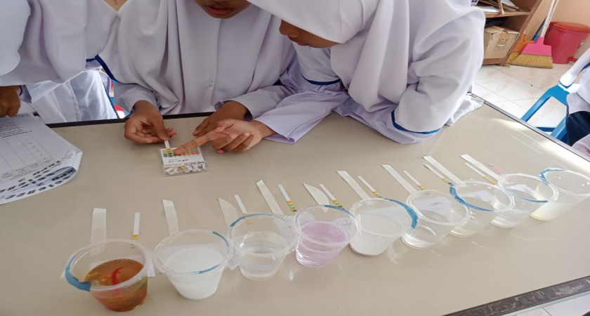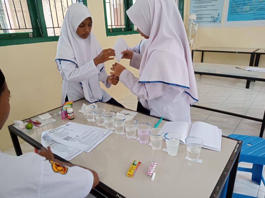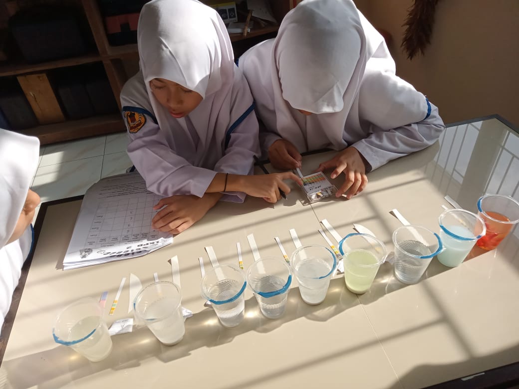 Praktikum kali ini bertujuan untuk mengidentifikasi sifat larutan (asam, basa dan garam/netral) serta mengelompokkan beberapa larutan sesuai sifatnya. Siswa/i kelas syafi'i antusias dalam praktikum menggunakan berbagai macam larutan mulai dari larutan jeruk nipis, larutan sabun, larutan soda, larutan cabai, dll. didampingi ibu Latifa Sahara, S.Pd selaku guru IPA, mereka juga belajar mengukur larutan menggunakan gelas ukur dan tabung reaksi serta mengukur PH larutan menggunakan PH universal yang tersedia di Laboratorium MTsN 1 Sabang. (Senin, 31 Januari 2022).